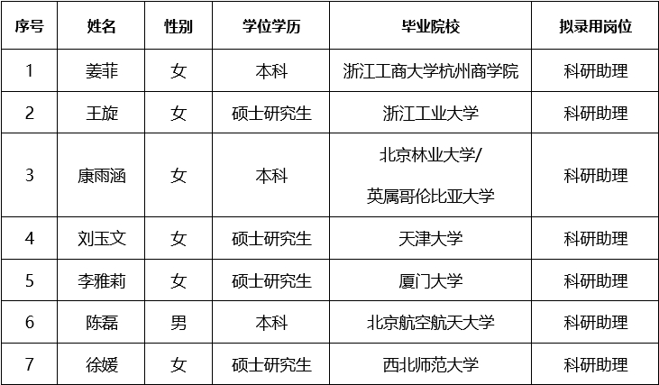 根据《杭州市北京欧美大片ppt免费大全中法航空研究院科研助理招聘公告》及研究院相关要求,经公开报名、综合考察及研究院审定,拟通过劳务派遣形式编外聘用姜菲等7名同志,现将拟聘用同志的情况公示如下: